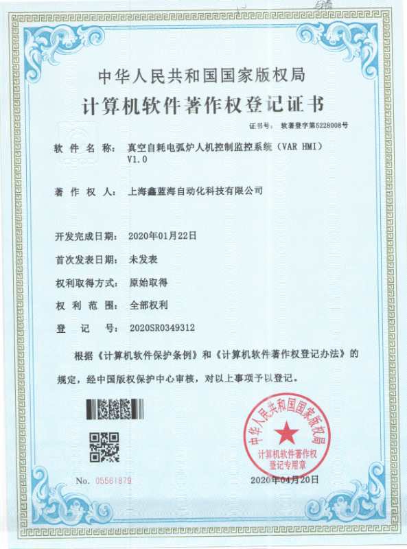 近日,上海鑫藍(lán)海自動化科技有限公司自主研發(fā)的真空自耗電弧爐人機(jī)控制監(jiān)測系統(tǒng)項(xiàng)目順利通過國家知識產(chǎn)權(quán)局審核,依照中華人民共和國專利法,由國家知識產(chǎn)權(quán)局正式頒發(fā)計算機(jī)軟件著作權(quán)登記證書。目前,該專利技術(shù)已成功運(yùn)用到我公司真空自耗電弧爐項(xiàng)目中,不僅節(jié)約了成本,創(chuàng)造了效益,同時有效地保護(hù)了企業(yè)的研發(fā)成果,極大的提高了我公司在冶金領(lǐng)域的核心競爭力!