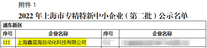 3月2日,上海市經濟和信息化委員會公布了“2022年上海市‘專精特新’企業名單”,鑫藍海位列名單之中,并順利通過公示期,正式獲得“2022年上海市‘專精特新’企業”認定。