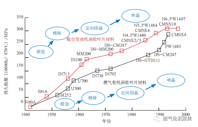 高溫合金材料在燃氣輪機及航空發動機等領域發揮著至關重要的作用。隨著航空發動機推重比增大,渦輪前溫度不斷提高,要求高溫合金的力學性能也相應提高。燃氣輪機功率和效率的不斷提高,是靠提高渦輪初溫(相當于航空發動機的渦輪進口溫度)來實現的,同樣需要采用承溫能力越來越高的高溫合金。